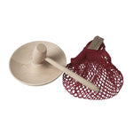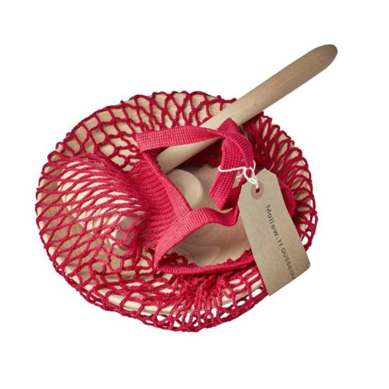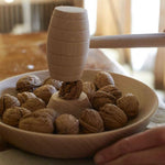 Ce casse noix en bois de hêtre qui sert à ouvrir les noix en préservant les cerneaux intacts nous rapproche des objets de la tradition populaire. Une fois la noix posée sur le promontoire, il faut avoir le bon geste et taper d'un coup sec. Le filet en coton rouge permet de ranger les noix et de le suspendre quand on a fini de s'en servir.