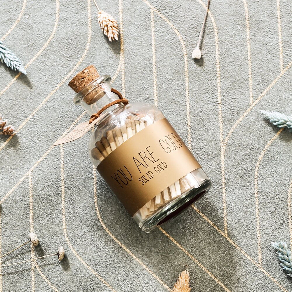 Un bocal en verre contenant 80 allumettes dorées. Avec ces allumettes, vous êtes totalement stylé avec vos bougies assorties. Sur le pot, vous trouvez le texte « You are gold ».