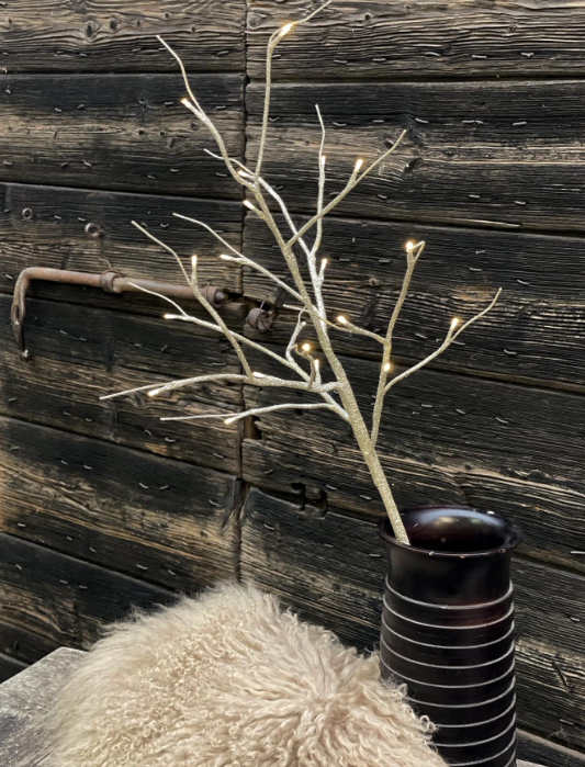 Branche lumineuse pailletée couleur champagne H 100 cm équipée de 20 LED, alimentée par 3 piles AA déjà incluses. En plus du mode ON/OFF, il est également équipé du mode TIMER : une fois allumé, la branche reste allumée pendant 6 heures, pour ensuite se rallumer le lendemain à la même heure. Idéal pour n'importe quelle pièce de la maison, il est également parfait pour décorer les restaurants, les bars, les hôtels ou les vitrines des magasins. Sa lumière douce crée immédiatement une atmosphère.