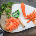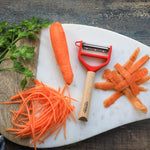 Une forme de rasoir, une double lame recto verso : l'éplucheur T-Duo est l'ustensile indispensable de la cuisine !
