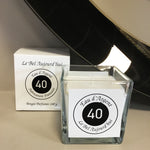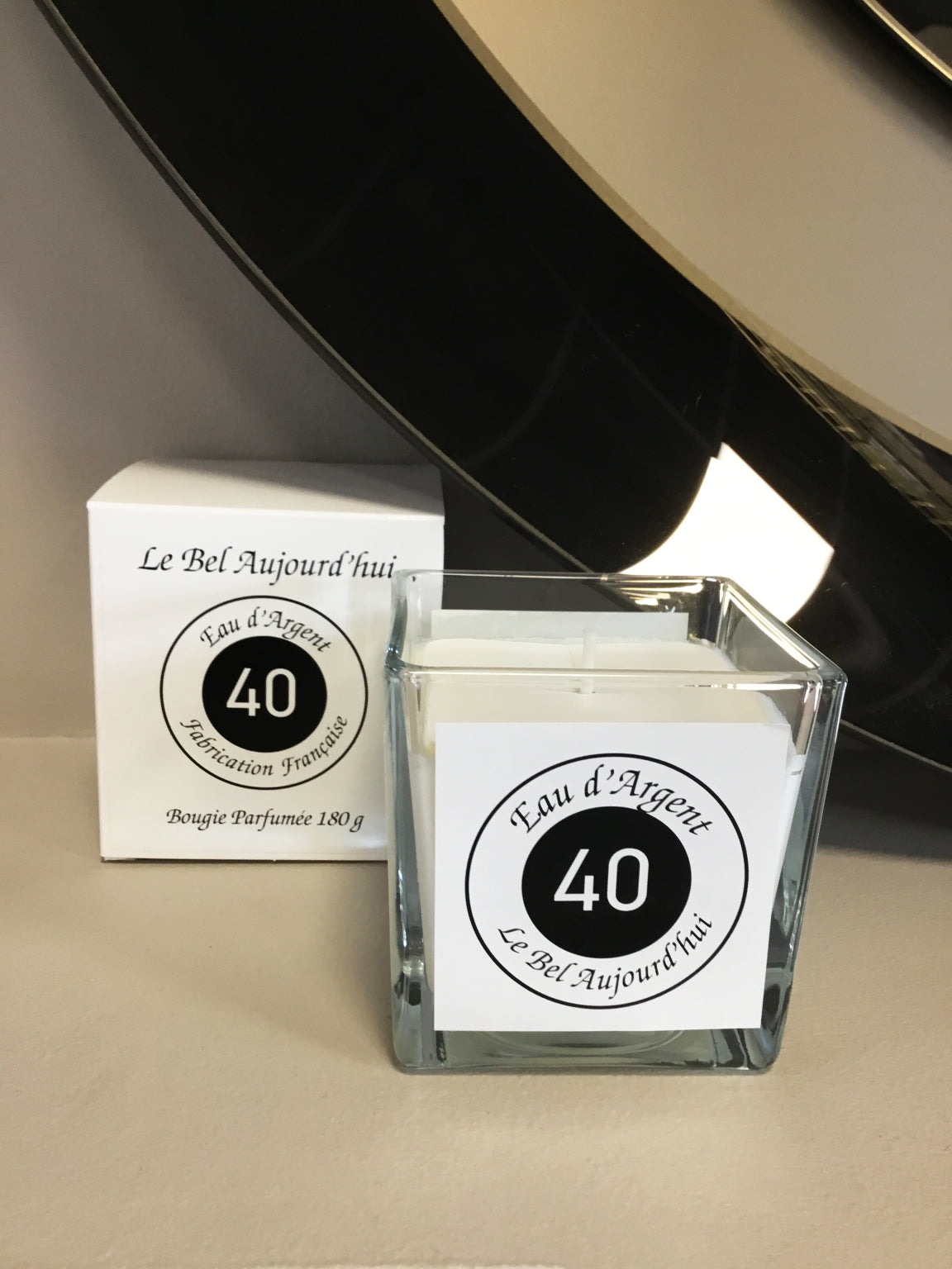 Bougie cube de 200 g de la Collection Numérotée avec boite packaging, emballée dans un papier de soie noir.