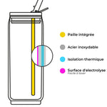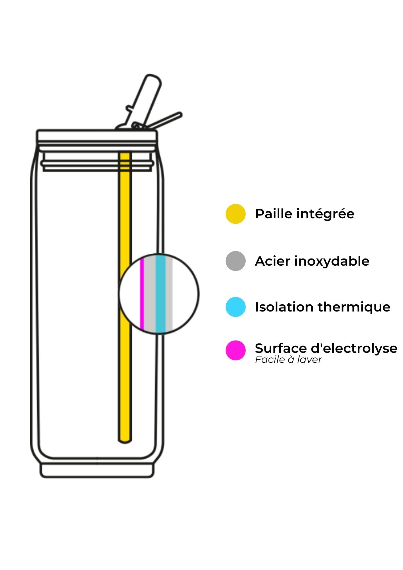 Elle est composée d’une double paroi en acier inoxydable qui permet de conserver les boissons chaudes pendant 5h et les boissons froides pendant 10h sans en modifier le goût. Le joint en silicone au niveau du couvercle ainsi que le bec rétractable permettent son étanchéité parfaite. La bague métallique facilite son ouverture, son design permet d’insérer des glaçons facilement et la paille incluse vous garantit une utilisation simple et ludique !