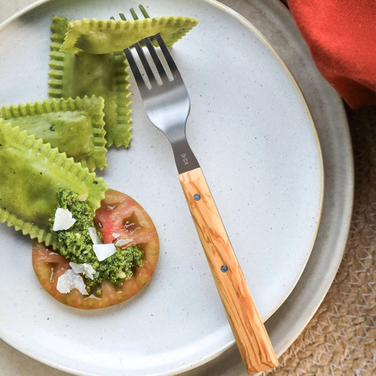La fourchette Sylve Olivier est équipée d'un manche en bois d'olivier au veinage unique, vernis et riveté. La fourchette est en acier inoxydable brossé. On retrouve la Main Couronnée sur le recto et la marque Opinel sur le verso.