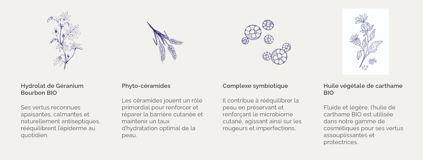 Avec 100% d’ingrédients d’origine naturelle, cette huile de soin bi-phase apaise votre peau grâce à l’alliance unique de l’eau florale de Géranium Bourbon Bio et d’un complexe de pré, pro et post biotiques, qui agit sur l’équilibre du microbiote cutané. Enrichie en phyto-céramides et acides gras essentiels, cette huile bi-phase primordiale renforce la barrière cutanée pour une peau plus forte. L’huile bi phase est testée sous contrôle dermatologique.