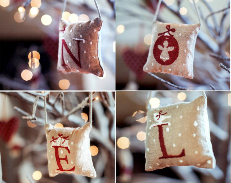 Petits coussins de Noel avec écriture rouge et blanche sur un tissue en coton couleur lin. Les quatre coussins composent le mot Noel. C'est une décoration originelle aussi pour votre sapin de Noel. Ils peuvent être suspendus sur le cheminée ou sur la porte d'entrée. Parfait comme coussin à épingles. Le prix se réfère au set de 4 coussins.