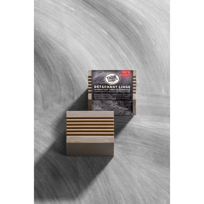 Puissant détachant végétal et minéral, cet authentique savon d’Alep, enrichi (en France) de 5 % de terre de Sommières, vient à bout des taches alimentaires (matières grasses, vin, café, thé), de cambouis, sang, encre et autres, sur tous les textiles : linge, tissus délicats, tapis.