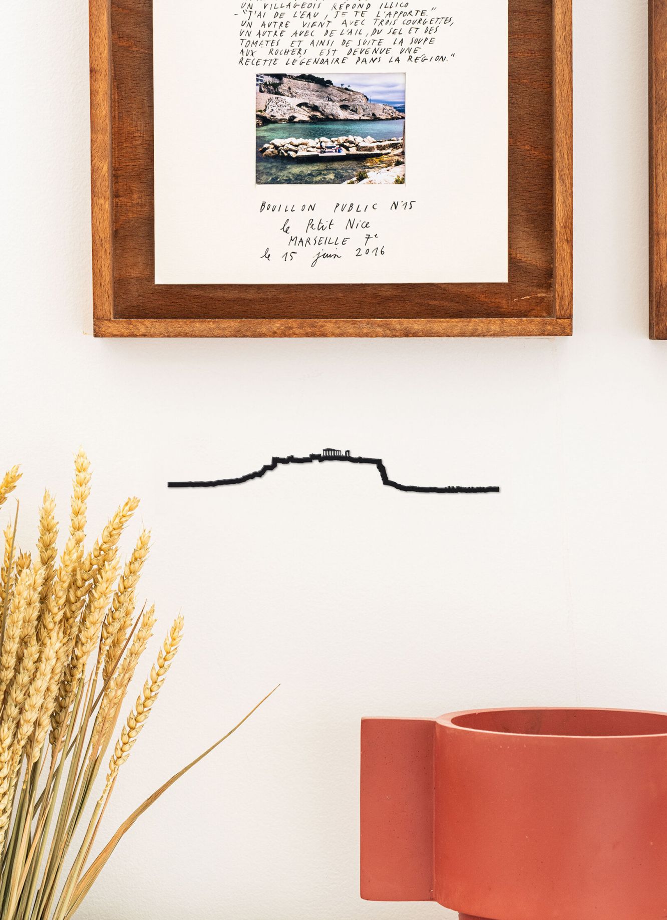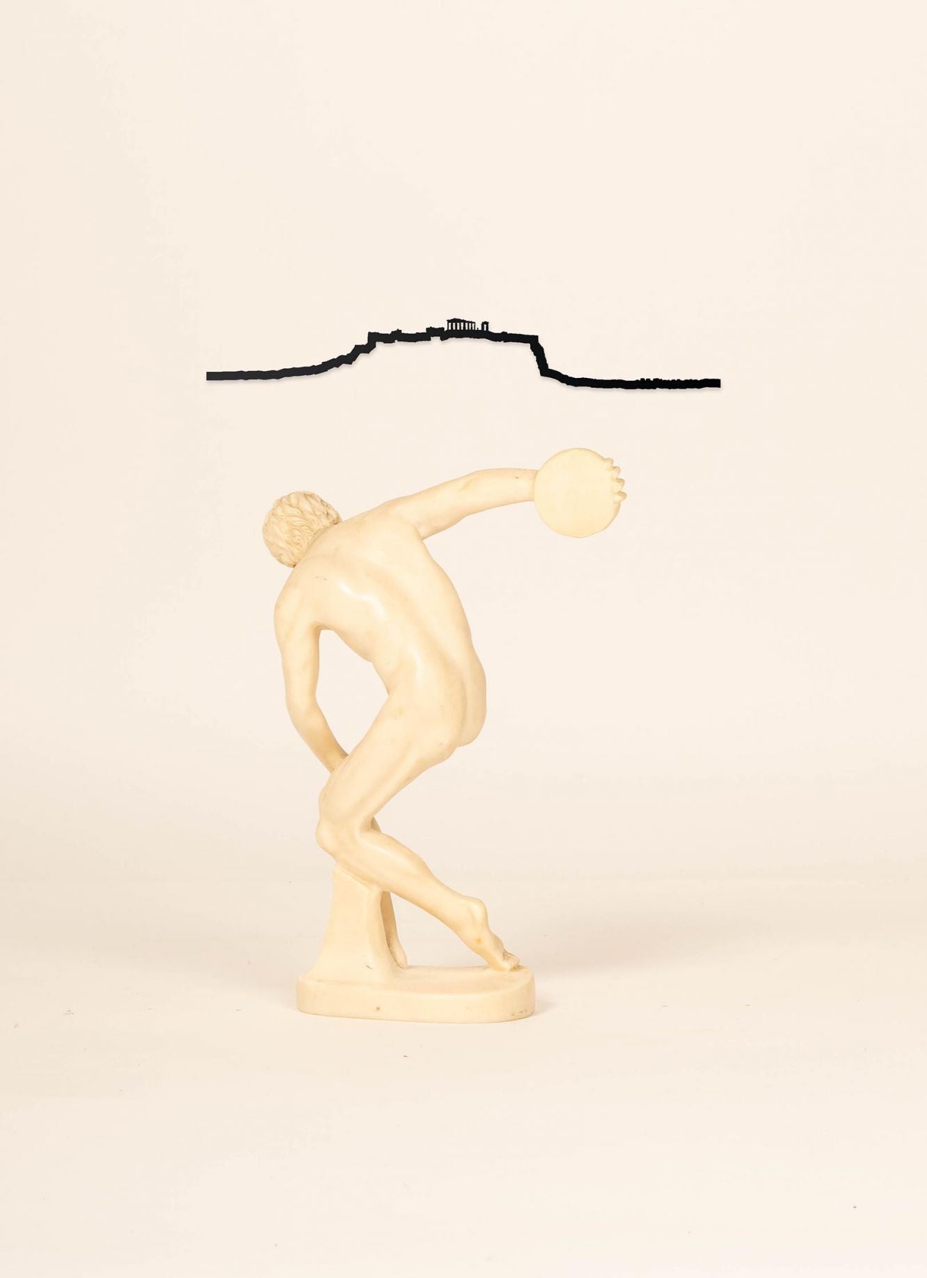 Nous avons représenté la silhouette d’Athènes depuis le Sud de la ville. On y voit le port du Pirée, l'Acropole et le Parthénon.