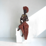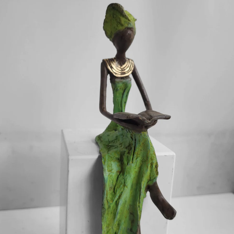 Cette élégante sculpture en bronze a été réalisée par l'artiste burkinabé Hamed Nikiema. La femme lisante est un symbole des femmes savantes et fortes en Afrique.