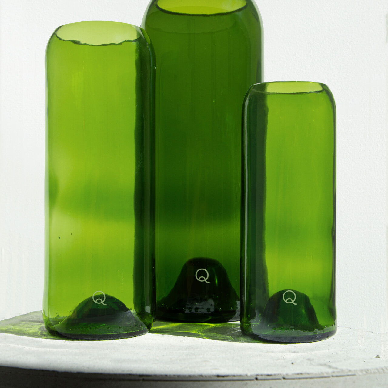 Des objets recyclés. Il y a, à l’origine de la marque Q de bouteilles , une appréciation juste, un regard porté sur l’élément brut: l’évidence d’une bonne idée. En coupant une bouteille pour en faire un verre, Q de bouteilles recycle le verre bien sûr, mais invente aussi une toute nouvelle histoire. Verres, vases, coquetiers, planches, bougies: sous son apparente simplicité, chaque pièce est unique.