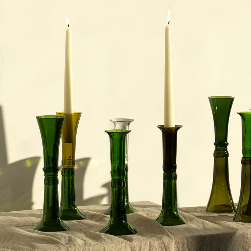 C'est du verre emblématique puisqu’il est issu de bouteilles de vin collectées via diverses sources d’approvisionnement, avec la mise en place de partenariats avec des professionnels du monde viticole: vignerons, embouteilleurs, fabricants. Ces entreprises nous proposent ponctuellement des lots de bouteilles destinés à être détruits pour diverses raisons. Et parfois des bouteilles plus singulières…