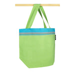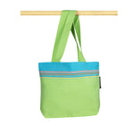 L'archipel des Bahamas est formé d'environ 300 îles à la végétation splendide. Le petit sac de plage Bahamas est très frais avec ce vert éclatant et sa bordure turquoise vif. De petites bandes bleu canard, violettes et jaunes lui donnent un côté fleuri, de fines lignes dans les tons jaune, orange et bleu mettent en valeur le côté joyeux de ce tissu.