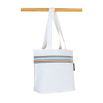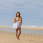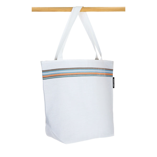 Le grand sac de plage familial en Kikoy Seychelles, plus blanc que blanc ! Avec ses rayures orange, brun et bleu, pour faire ressortir les peaux dorées.