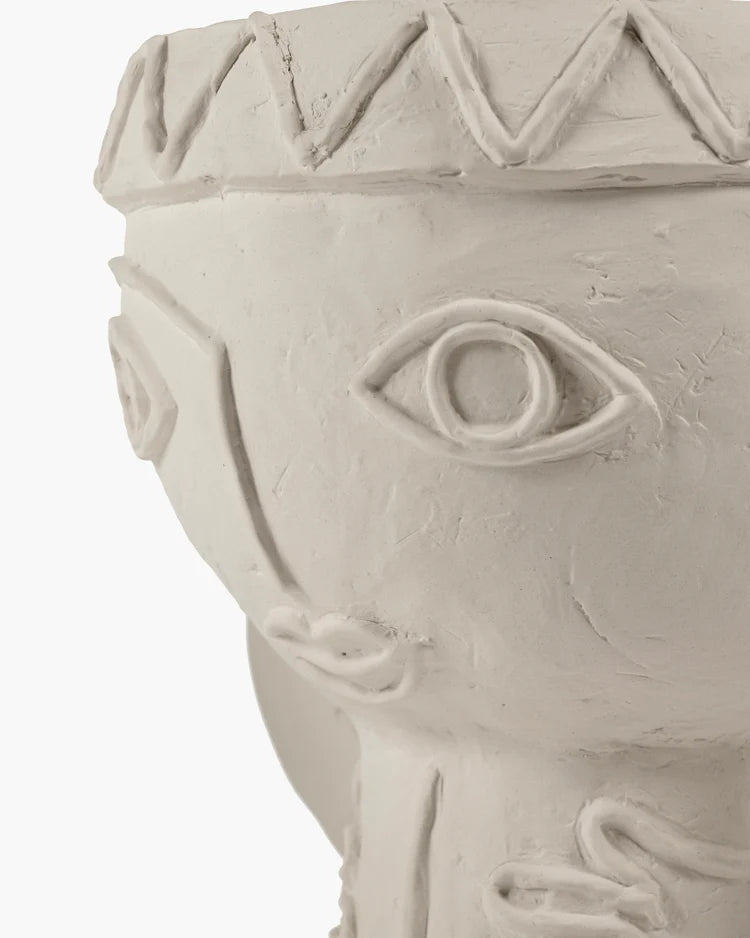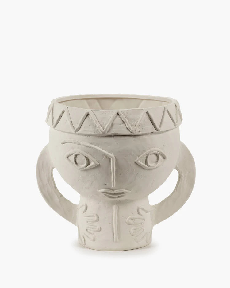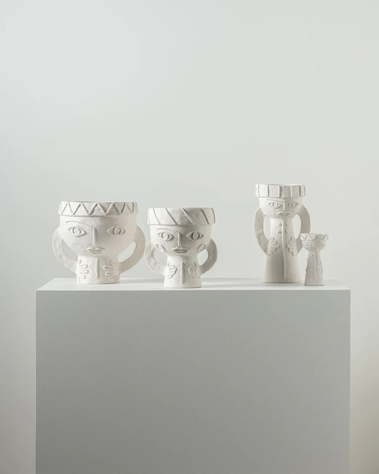 Le vase L 02 blanc reflète le style de conception de Marie Michielssens, où les mains et les yeux des femmes sont mis en évidence. La coiffe et la tenue des femmes sont détaillées dans un souci de perfection, ce qui contraste avec la finition plus brute de l’argile chamotte. L’intérieur et la base des vases sont enrobés d’une glaçure transparente mate.