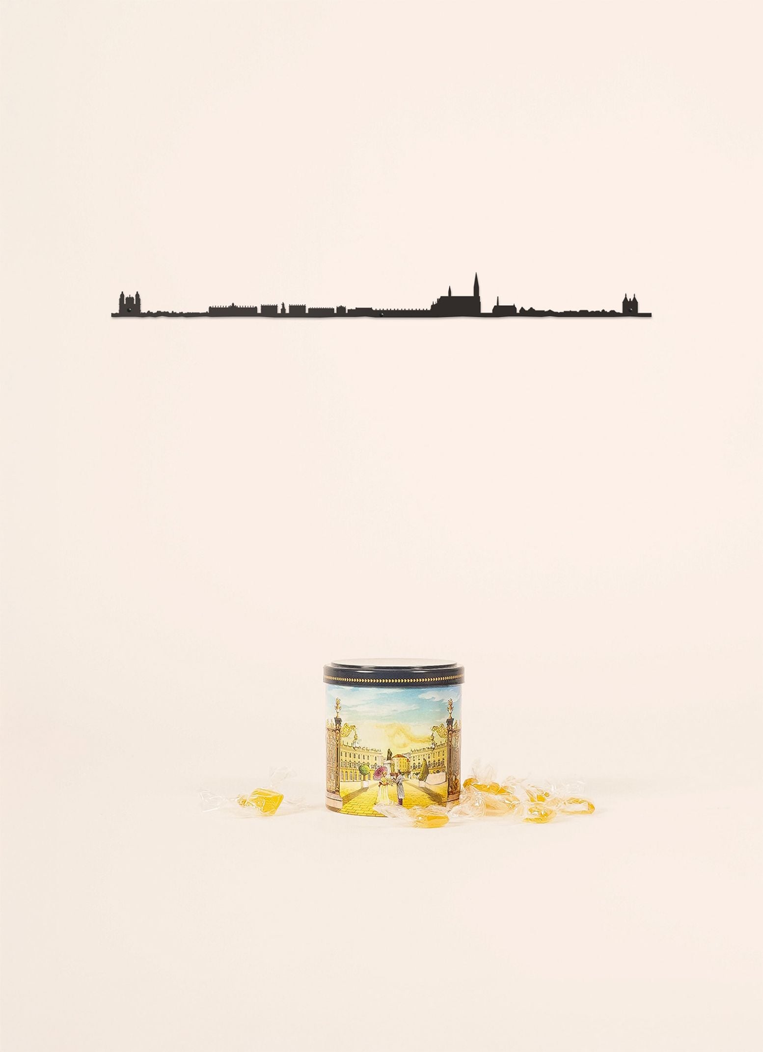 Nous avons représenté la silhouette de Nancy depuis l'est de la ville. On y voit, du nord au sud, la cathédrale Notre-Dame, l'Hôtel de ville, la place Stanislas, le musée des Beaux-Arts, la basilique Saint-Epvre, le palais des Ducs et la porte de la Craffe.
