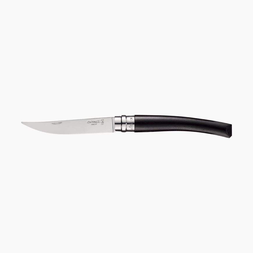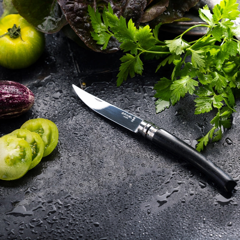 La nouvelle version de l'effilé 10 ébène propose un couteau unique : une lame en poliglace de 10 cm, un manche en ébène bufflé avec une cire spécifique et une virole de sécurité Virobloc marquée du nouveau logo de la gamme. C'est un couteau de poche mais aussi de table, car la taille de sa lame et sa qualité de coupe permet de découper n'importe quel aliment.