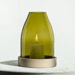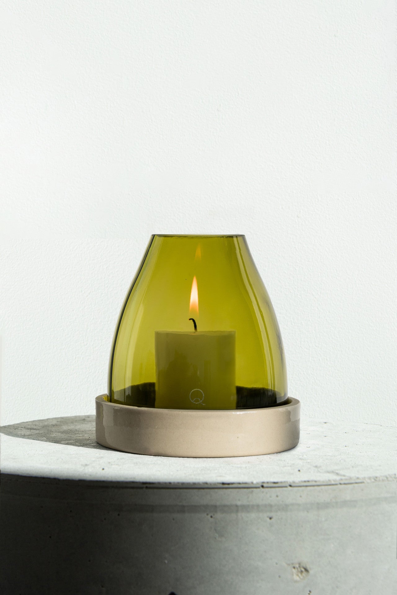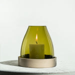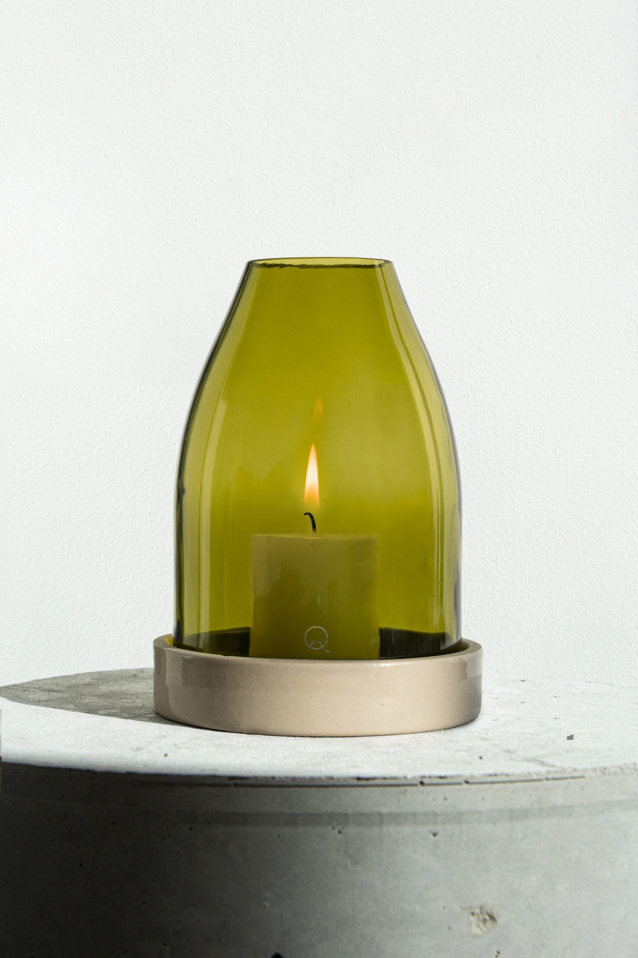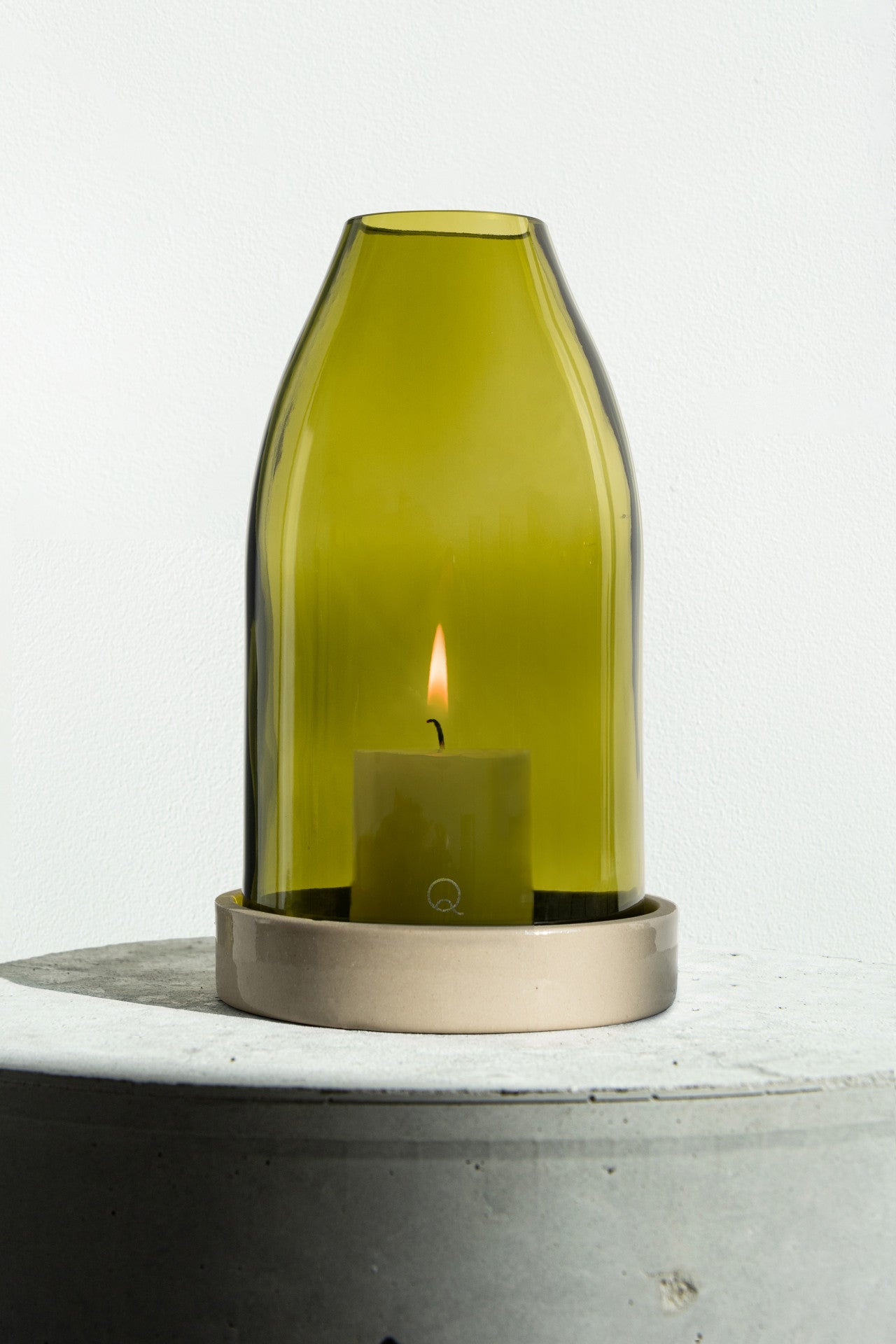 The glass cloche is made by Q of bottles from a magnum of Burgundy wine, showcasing the beauty of raw and recycled glass. The sandstone base is manufactured by the Digoin Manufacture. This tealight holder is a great example of how two makers can combine their skills to create something new and unique. It is also a tribute to French craftsmanship and the preservation of local know-how.