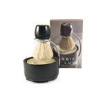 Shaving brush with black lacquered beech handle, abundant boar bristles, ergonomic and robust.