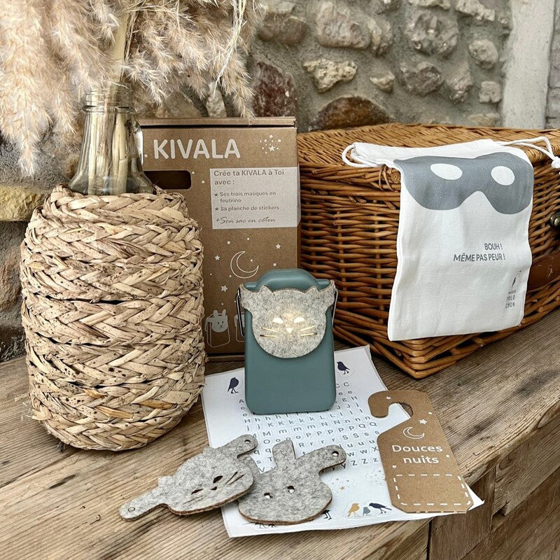 - Le coffret contient la lampe KIVALA, 3 masques feutrine de laine interchangeables, 1 planche de stickers alphabet pour la personnaliser et 1 pochon en coton pour l'emmener partout !