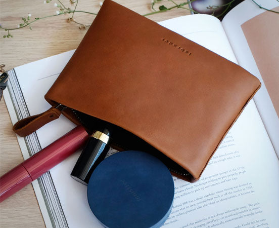 Our zipped pouch in full grain leather and suede is available in 2 different formats to store your belongings (makeup, pens, change, phone, etc.). Their design was handmade, both very resistant and lightweight, it is equipped with 'a zip and tab closure for a better hold. It also has a bellows taking up its entire surface to ensure maximum space. Our leather has a very pleasant feel, which over time develops a patina and ensures real sensory pleasure.