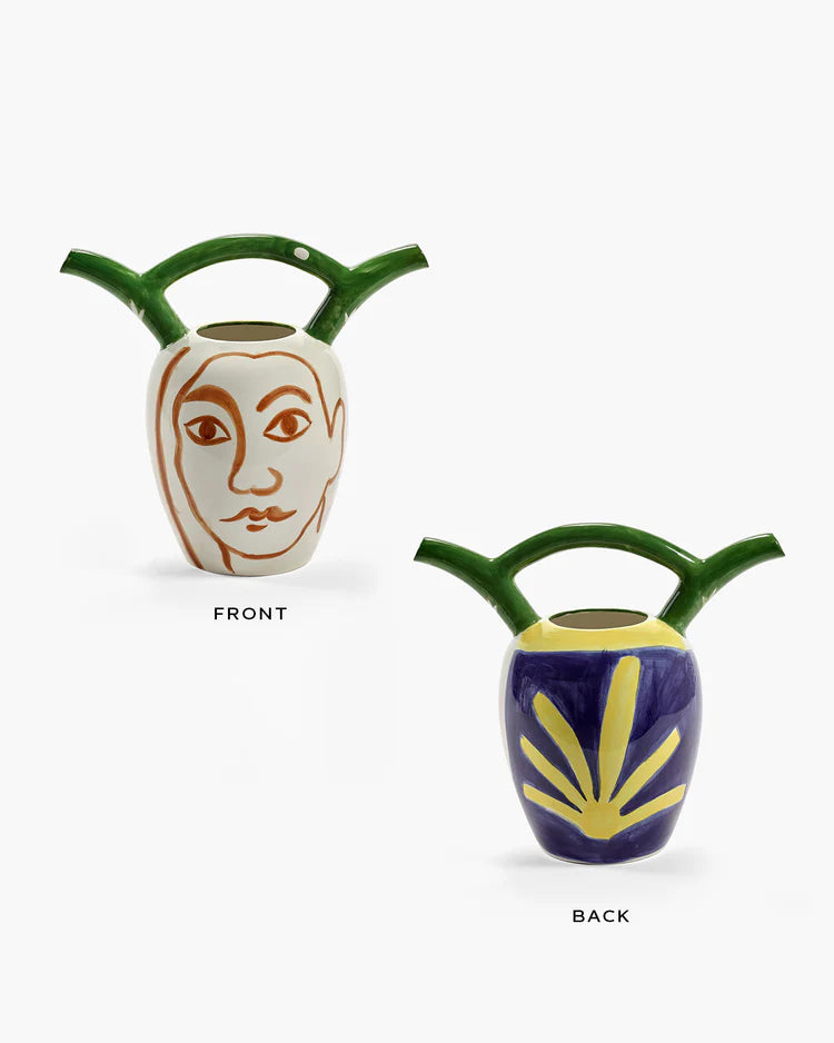 Les vases Santiago de Borja de Shirley Villavicencio Pizango donnent vie aux vases colorés de ses peintures. Chaque pièce peinte à la main reflète la chaleur et la nature sauvage de l’Amazonie, avec des couleurs intenses et des formes organiques inspirées par la nature. Ce vase présente une illustration différente à l’avant et à l’arrière, ce qui vous permet de le faire pivoter selon vos envies.