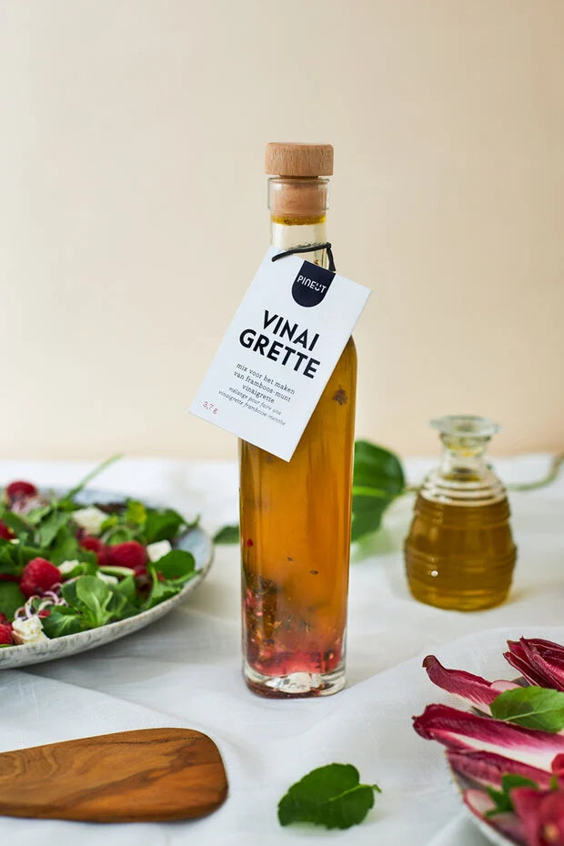 Aussi italiens que soient nos ingrédients, la vinaigrette est française. Oui, oui, c'est une vinaigrette française classique pour la salade. Un mélange d'huile et de vinaigre dans un rapport de 3 à 1. Normalement assaisonné de sel, de poivre ou d'herbes du jardin. Mais comme vous l'avez appris de nous, Pineut fait les choses un peu différemment. Le mélange d'herbes (italiennes), d'épices et de légumes fait de nos vinaigrettes une bizarrerie. Mais unique en son genre.