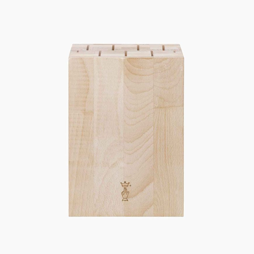 Le bloc de 9 emplacements (7 grandes lames et 2 petites lames) rappelle le parallélépipède de bois brut dans lequel sont façonnés les manches de couteaux Opinel.