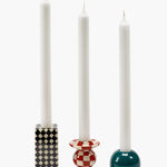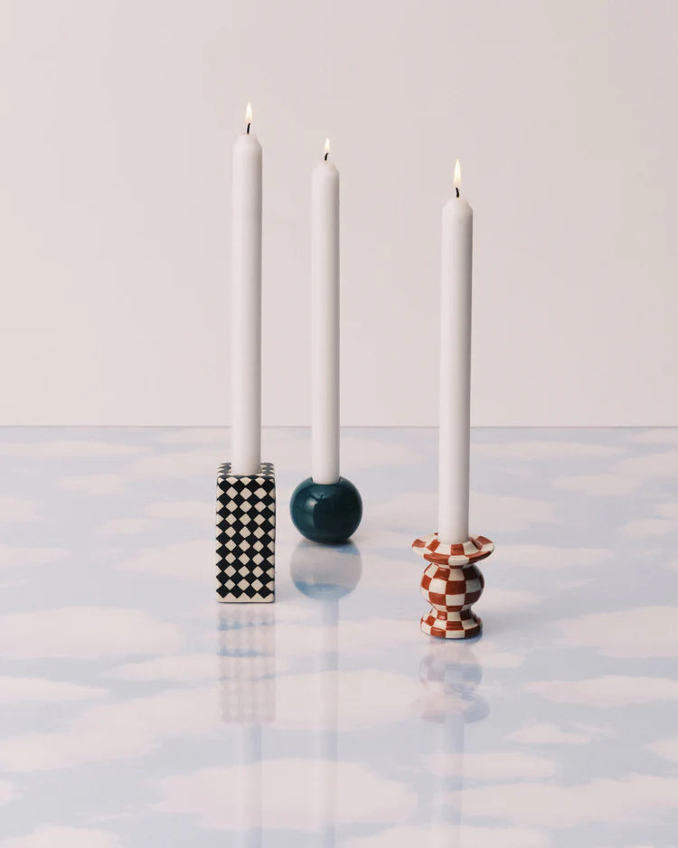 Les bougeoirs en céramique de la collection Les Objets Mouleversants s’inspirent des éléments iconiques de Wouters & Hendrix, notamment le motif surréaliste du damier. Peints à la main et fabriqués avec soin, ils apportent une touche d’équilibre et de fantaisie à tout espace. Disponibles en trois formes distinctes.