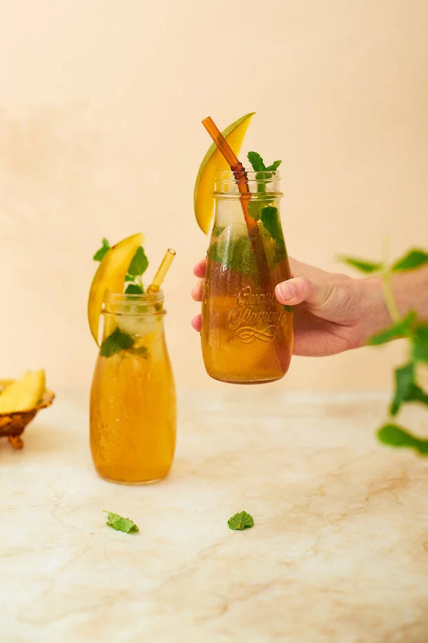 La combinaison de mangue séchée et de thé vert est l'été dans un verre. C'est comme si vous buviez des rayons de soleil. Mais délicieusement rafraîchissant. Vous comprenez ? Exactement. Les saveurs merveilleuses de notre mangue durable du Burkina Faso et du thé équitable de Frank about tea prennent le temps de se développer pleinement grâce au processus d'infusion à froid. Glacé et le plus délicieux !